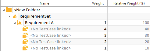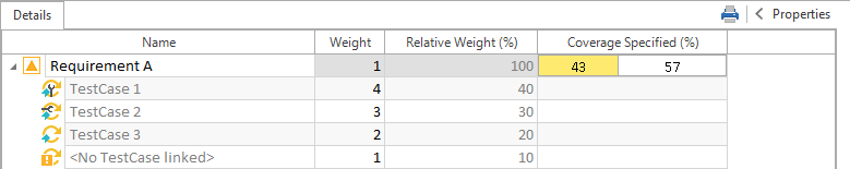 Dieses Beispiel führt Sie durch den Prozess der Berechnung der Coverage Specified (%). Die Berechnung basiert auf der relativen Gewichtung und dem Status der verknüpften Testfälle.