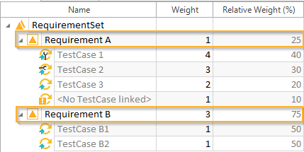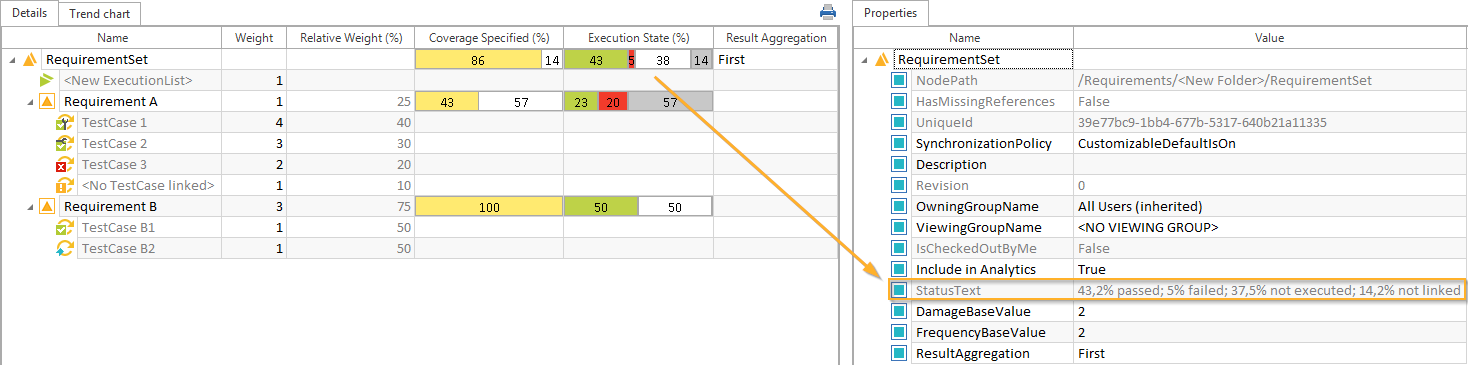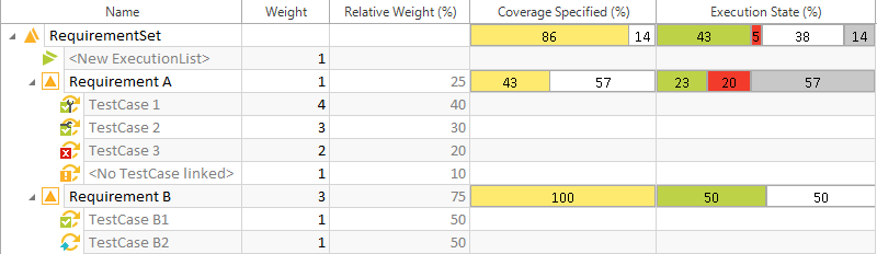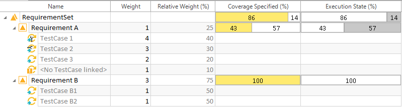 Dieses Beispiel führt Sie durch den Prozess der Berechnung des Execution State (%) eines Anforderungs-Sets. Die Berechnung basiert auf den relativen Gewichtungen und Testfallstatus der verknüpften Testfälle.