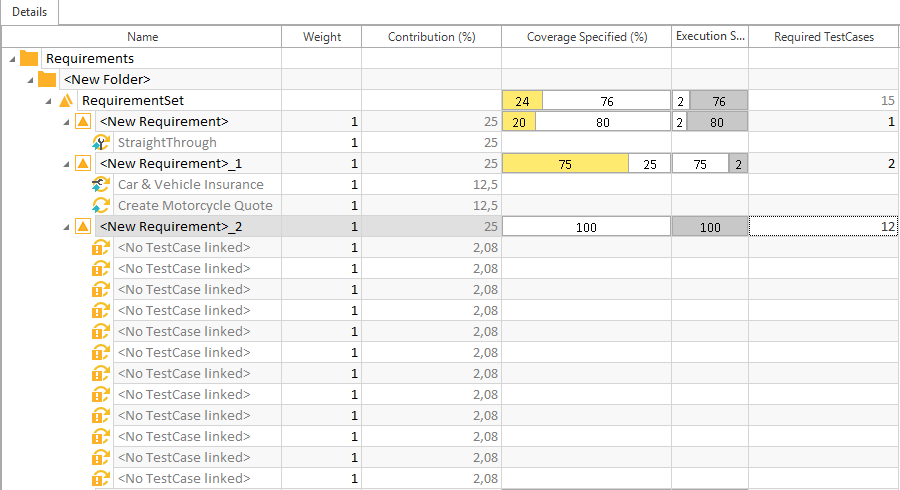 Fügen Sie im Bereich Requirements die Spalte Required TestCases zur Ansicht Details hinzu (siehe Kapitel " Spalten hinzufügen oder entfernen").