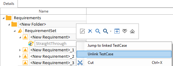 Klicken Sie dazu mit der rechten Maustaste auf eine Testfall-Verknüpfung und wählen Sie im Kontextmenü Unlink TestCase.