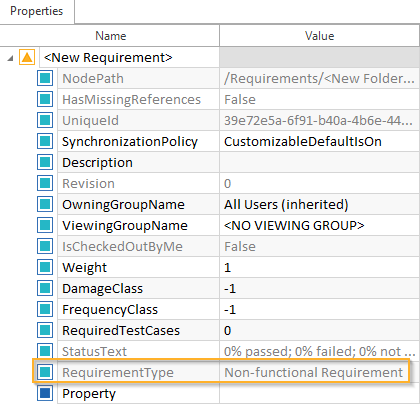 Wenn Sie eine Anforderung anlegen, ist die Eigenschaft Anforderungstyp standardmäßig Requirement. Um verschiedene Arten von Anforderungen, wie z. B. funktionale und nicht-funktionale Anforderungen, zu unterscheiden, können Sie zusätzliche Anforderungstyp-Definitionen anlegen und zuweisen.