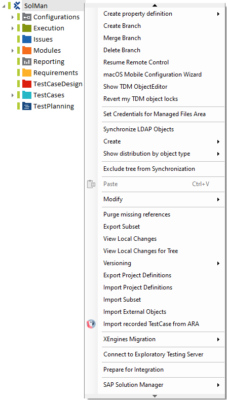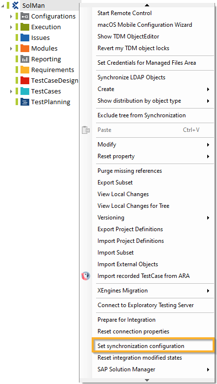 Um die Konfigurationsdatei zu erstellen, klicken Sie mit der rechten Maustaste auf das Projektwurzelelement im Tosca Commander und wählen Sie die Option Set synchronization configuration aus dem Kontextmenü.