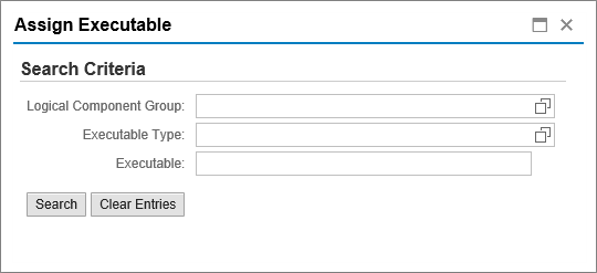 Alternativ können Sie eine Logische Komponentengruppe, den Typ der ausführbaren Einheit und eine Ausführbare Einheit auswählen, um nach einer ausführbaren Einheit zu suchen. Klicken Sie auf Suchen und doppelklicken Sie auf die ausgewählte ausführbare Einheit, um sie zuzuweisen, und schließen Sie das Fenster.