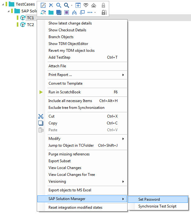 Klicken Sie mit der rechten Maustaste auf das Projektwurzelelement, den Testfall oder den Testfallordner und wählen Sie SAP Solution Manager->Set Password aus dem Kontextmenü.