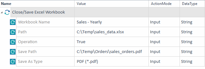 In diesem Beispiel schließen Sie die Excel-Datei sales_data.xlsx, die sich unter C:\Temp befindet. Die Excel Engine 3.0 speichert alle Änderungen an sales_orders.pdf unter C:\Temp\Orders. Sie geben das Dateiformat als PDF (*.pdf) an.