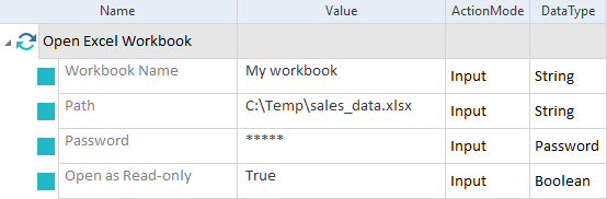 In diesem Beispiel öffnen Sie die Excel-Datei sales_data.xlsx, die sich unter C:\Temp befindet. Sie vergeben den Namen MyWorkbook an die Arbeitsmappe, die Sie steuern möchten. Da die Datei passwortgeschützt ist, geben Sie das Passwort ein und öffnen die Datei im schreibgeschützten Modus.