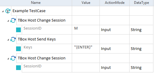 In diesem Beispiel verwenden Sie den ersten Testschritt, um in die Session mit der Session-ID M zu wechseln. Im zweiten Testschritt senden Sie den Befehl Enter an die Applikation. Da der Wert des dritten Testschritts leer ist, löscht die Host Engine 3.0 die Session M.