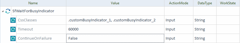 Dieses Modulattribut ist optional. Mit der CSS-Klasse wird das wartende Element identifiziert. SfWaitForBusyIndicator wartet, bis das in CssClass angegebene Element verschwindet. Wenn der Auslastungsindikator in Salesforce benutzerdefinierte CSS-Klassen verwendet, geben Sie den Namen Ihrer CSS-Klasse ein. Zum Beispiel .customBusyIndicator. Wenn Ihr Auslastungsindikator mehrere CSS-Klassen verwendet, trennen Sie diese mit einem Komma. Zum Beispiel .customBusyIndicatorCircle, .customBusyIndicatorLocal. Wenn Sie eine CSS-Klasse angeben, sucht Tosca nach den Standard-CSS-Klassen und benutzerdefinierten CSS-Klassen. |