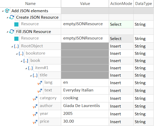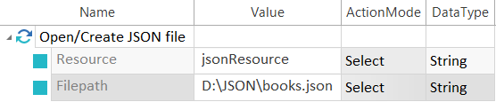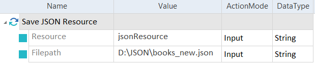 Im obigen Beispiel haben Sie die Ressource jsonResource aus der Datei books.json erstellt. In diesem Beispiel speichern Sie alle Änderungen, die Sie an der Ressource vorgenommen haben, in der Datei books.json. Da das Feld Value für Filepath leer ist, speichert die JSON Engine 3.0 die Änderungen in der Datei, aus der Sie die Ressource ursprünglich geladen haben.