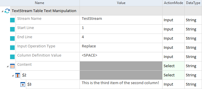 In diesem Beispiel hängen Sie neuen Inhalt an die letzte Zeile eines TextStream namens TestStream an. Er hat vier verschiedene Felder, die ein Semikolon als Trennzeichen verwenden. Im Testschritt Block Text Manipulation - Input führen Sie die folgenden Aktionen aus: