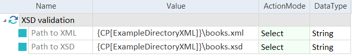In diesem Beispiel validieren Sie die XML-Datei books.xml anhand des XML-Schemas books.xsd. {CP[ExampleDirectoryXML]} bezieht sich auf den Dateipfad, den Sie im Testkonfigurationsparameter ExampleDirectoryXML definiert haben.