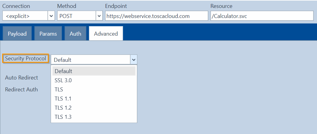 Der Tricentis Tosca API Scan kann beim Senden Ihrer Nachrichten ein bestimmtes Sicherheitsprotokoll verwenden.