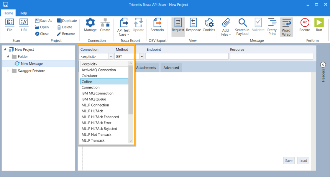 Transportinformationen geben an, wie und wo Sie Ihre Nachricht senden. Sie können folgende Transportinformationen Ihrer Nachricht im Nachrichtenabschnitt des Tricentis Tosca API Scan-Fensters bearbeiten:
