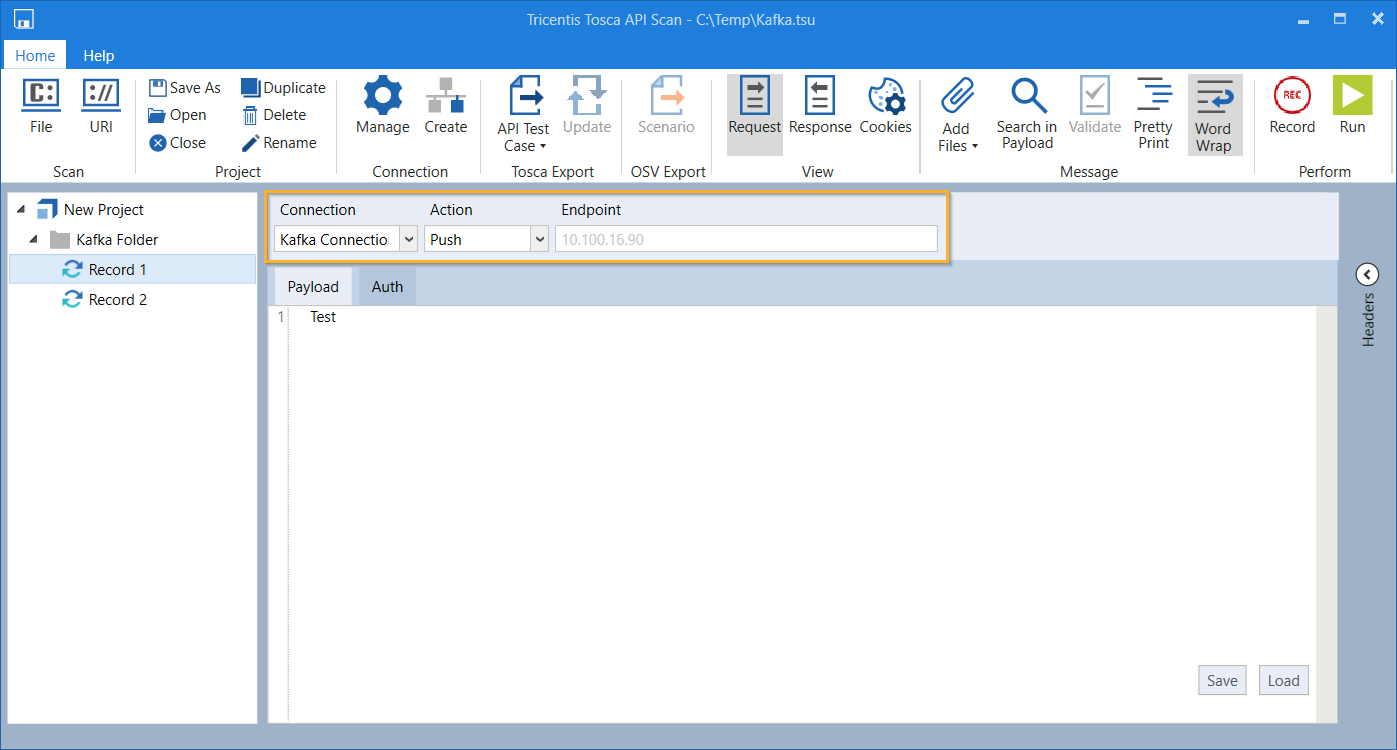 Der Tricentis Tosca API Scan ermöglicht es Ihnen, Nachrichten über eine Apache-Kafka-Verbindung auszuführen. Ein Kafka-Thema speichert Nachrichten, z. B. Nachrichten, die von einem oder mehreren Publishern gesendet und von einem oder mehreren Consumern gelesen werden. Dadurch können verschiedene Systeme unabhängig voneinander kommunizieren, z. B. wenn eines von ihnen offline ist. Darüber hinaus können Kafka-Themen in mehrere Partitionen unterteilt werden. Dies ermöglicht die Verteilung großer Datenmengen auf einen oder mehrere Server.