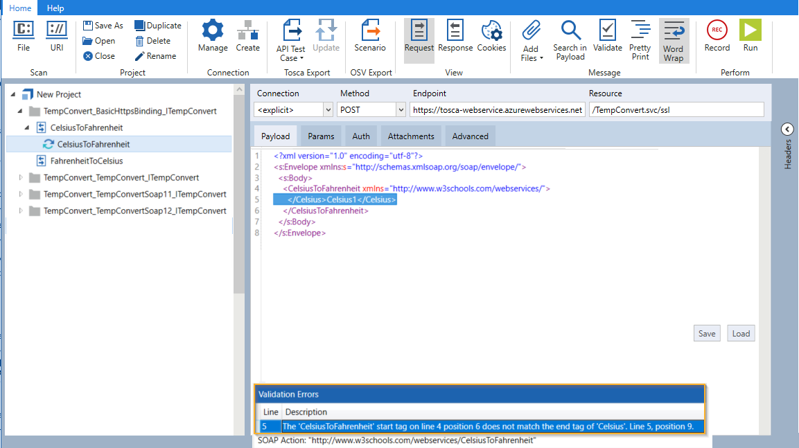 Wenn die Nachricht einen Fehler enthält, generiert der API Scan eine Fehlermeldung einschließlich einer Fehlerbeschreibung.