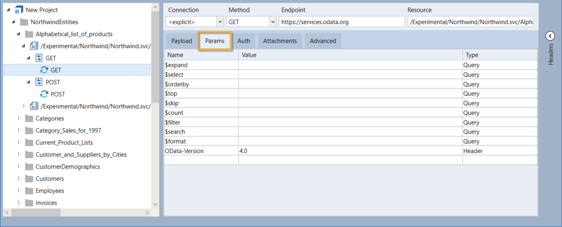 Um die Systemabfrageoptionen und URL-Parameter anzuzeigen, wechseln Sie zum Reiter Params.