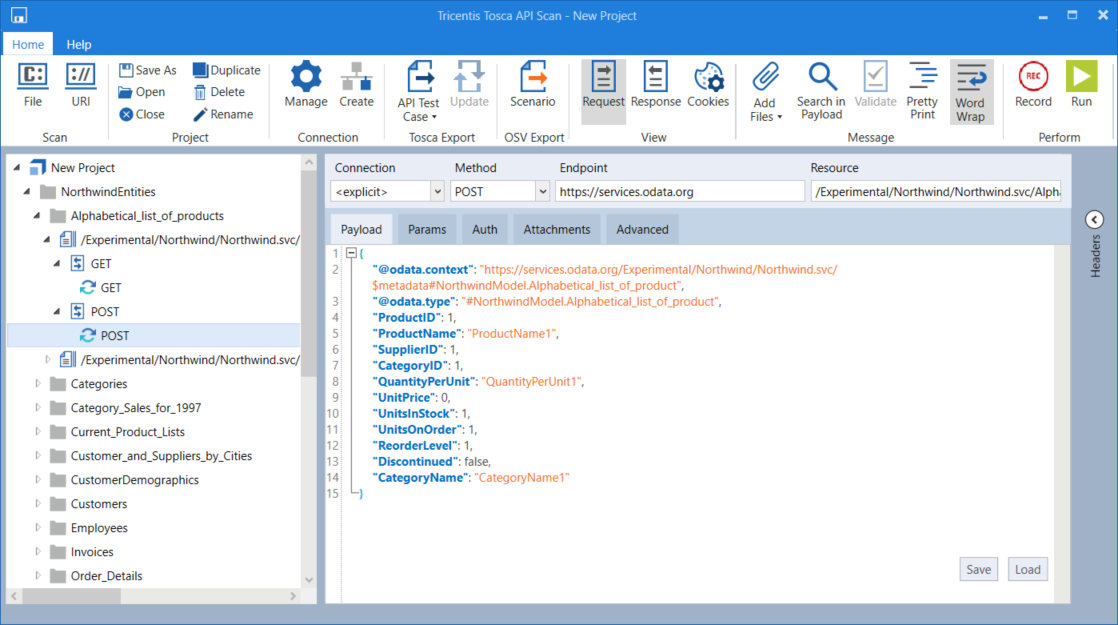 Nachdem der API Scan den URI aufgezeichnet hat, zeigt der Projektbaum auf der linken Seite die Aufzeichnungsergebnisse an. Für OData-Services generiert der API Scan automatisch Nachrichten mit einer JSON-Payload.