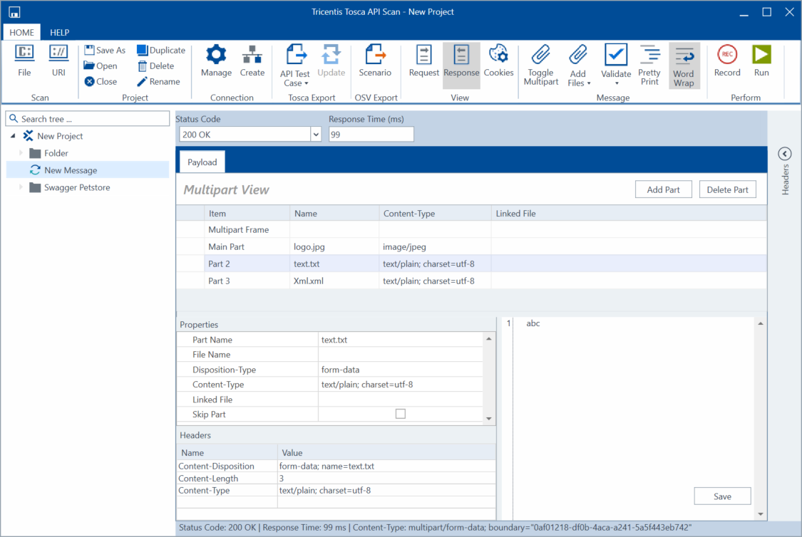 Sie können zusammen mit Ihren API-Nachrichten auch Anhänge empfangen. Im Reiter Payload der Response-Nachricht werden diese empfangenen Anhänge als mehrteilige Nachricht angezeigt und Sie können sie speichern.
