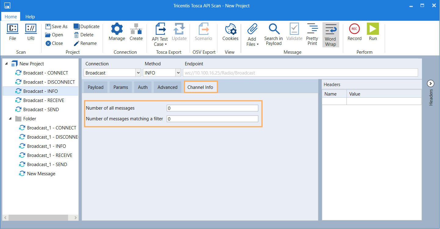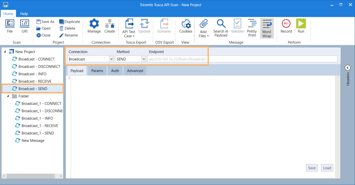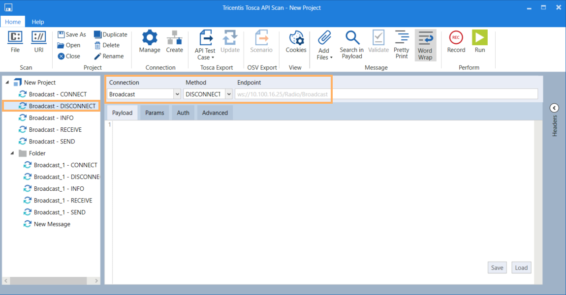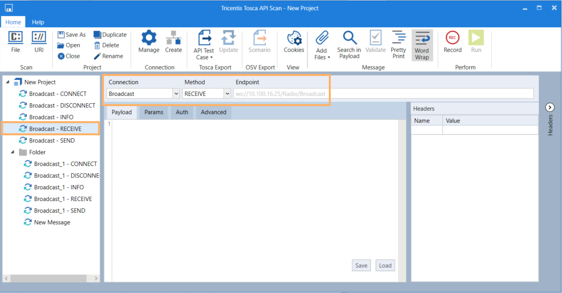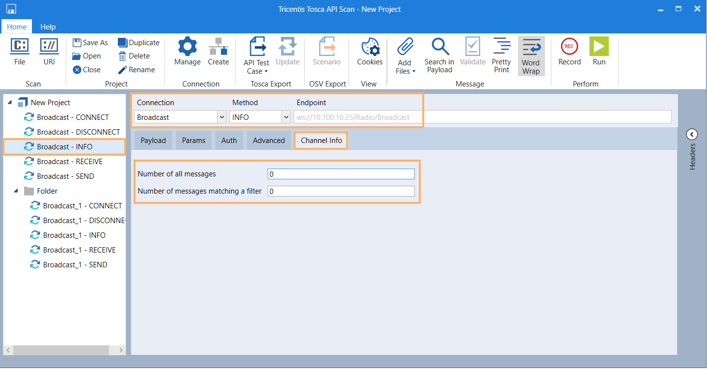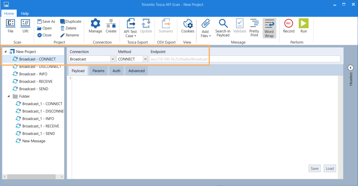 Der Tricentis Tosca API Scan ermöglicht es Ihnen, WebSocket-Nachrichten (WS-Nachrichten) über eine WebSocket-Verbindung auszuführen. Zusätzlich können Sie eine RAML-Datei aufzeichnen, die WebSocket-Definitionen enthält, wie in Kapitel " RAML für Websocket-Definition verwenden" beschrieben.