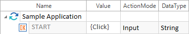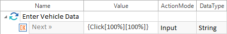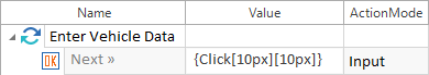 Klick-Operationen müssen in geschwungenen Klammern angegeben werden. Ein Klick erfolgt standardmäßig in die Mitte des entsprechenden Controls. Klick-Operationen simulieren das Benutzerverhalten.