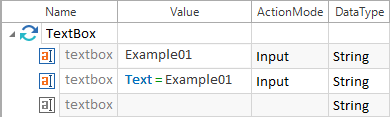 Eine Textbox besitzt die Standardeigenschaft Text. Soll eine Eingabe in eine Textbox erfolgen, muss daher die Control-Eigenschaft nicht explizit angegeben werden. Folgende Steuerungsmöglichkeiten führen zu dem Ergebnis, dass der Wert Beispiel01 in die Textbox geschrieben wird: