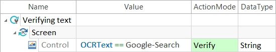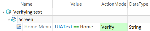 Der Text eines Controls wird verifiziert. Dabei entspricht der Text des Controls nicht immer dem Text des Bildes, das für die Identifikation aufgezeichnet wurde. Die Verifikation erfolgt über die Eigenschaft UIAText. Die Aktion ist Verify. Es wird der in der Spalte Wert definierte Wert überprüft.