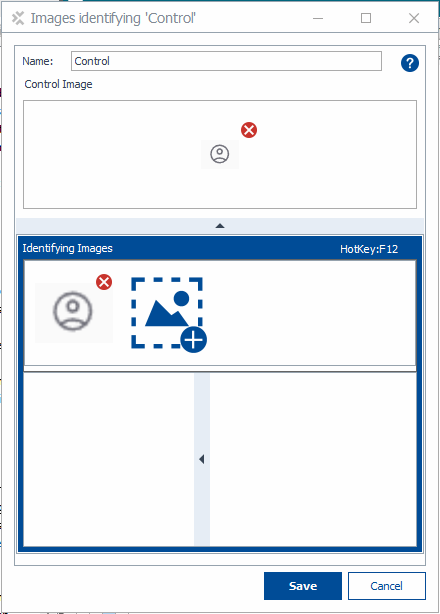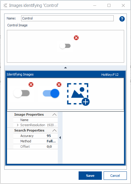 Sie können mehrere Bilder für ein Control speichern. Zum Beispiel, wenn sich eine Umschaltfläche je nach Kontext ändert. Für die Identifikation muss eines der Bilder gefunden werden.