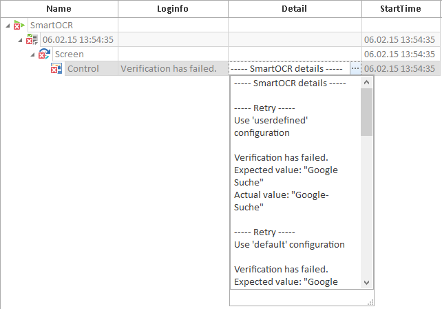 Wird der Text nicht gefunden, werden die Ergebnisse der einzelnen vorgenommenen Schritte in der Spalte Details angezeigt (SmartOCR).