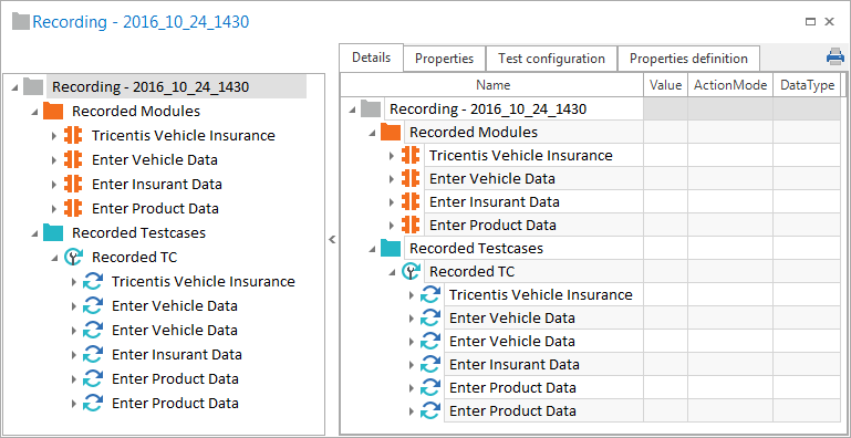 Mit diesen Modulen erstellt Tricentis ARA einen Testfall, der auf Ihren aufgezeichneten Aktionen basiert. Er speichert den Testfall im Testfallordner Recorded Testcases im gleichen Komponenten-Ordner wie die neu aufgezeichneten Module.