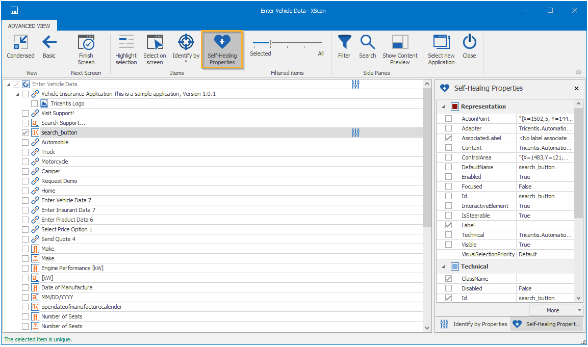 Wenn Sie den Tosca XScan, Tosca Rescan, Salesforce Scan oder Tricentis ARA verwenden, wählt Tosca während der Aufzeichnung vorab automatisch Selbstheilungseigenschaften aus und fügt auf dem Reiter Self-Healing Properties des Modulattributs nach der Aufzeichnung Selbstheilungseigenschaften hinzu. Diese Eigenschaften speichern technische Daten des Controls. Beim Salesforce Scan speichern diese Eigenschaften jedoch die für Salesforce spezifischen technischen Daten. Tosca verwendet diese Daten für eine Selbstheilung des defekten Controls.