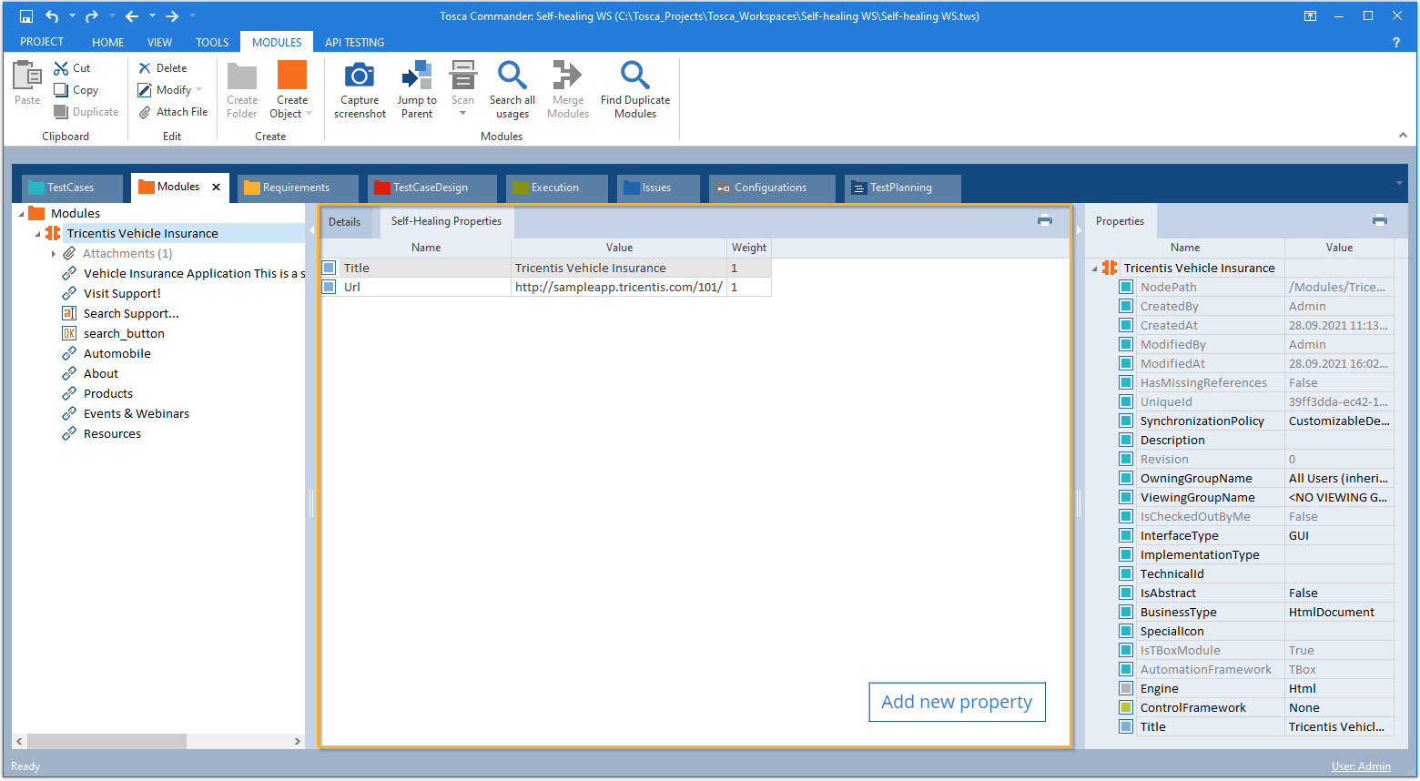 Wenn Sie ein Modul mit dem Tosca XScan, Tosca Rescan, Salesforce Scan oder Tricentis Automation Recording Assistant (Tricentis ARA) erstellen, fügt Tosca auf dem Reiter Self-Healing Properties des Modulattributs automatisch selbstheilende Eigenschaften hinzu. Diese Eigenschaften speichern die technischen Daten des Controls. Beim Salesforce Scan speichern diese Eigenschaften jedoch die für Salesforce spezifischen technischen Daten. Tosca verwendet diese Daten für eine Selbstheilung des defekten Controls.