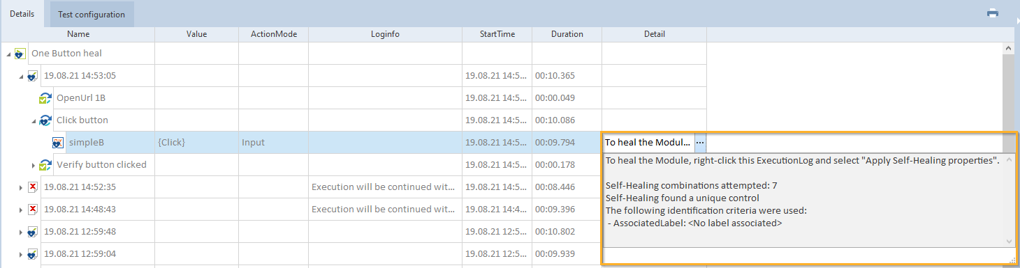 auf den Ausführungseinträgen an, dass eine Selbstheilung des Testfalls erfolgt ist. In der Spalte Detail des Ausführungs-Logs werden Informationen zu selbst geheilten Objekten angezeigt.