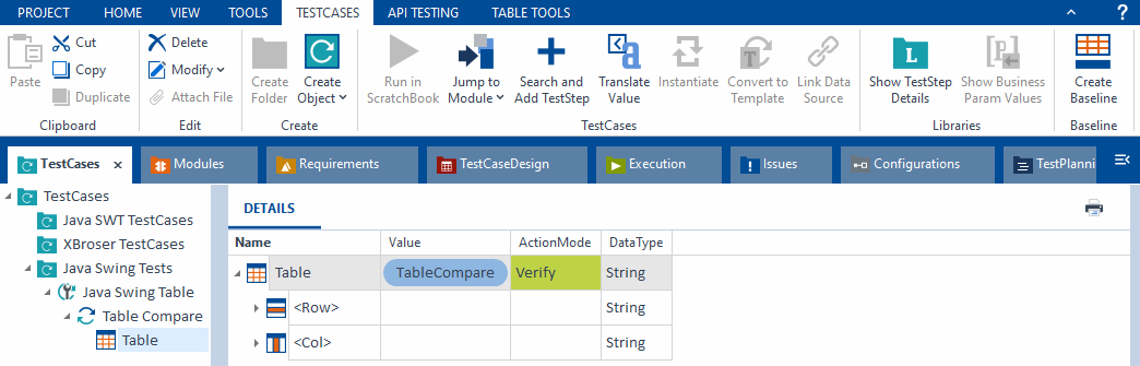 Klicken Sie auf das Table-Control und wählen Sie im dynamischen Menü TESTCASES die Option