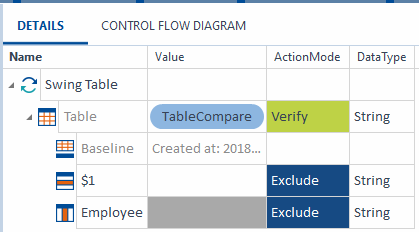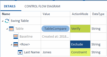 Wenn Sie bestimmte Zeilen oder Spalten vom Tabellenvergleich ausschließen möchten, wählen Sie im Aufklappmenü der Spalte ActionMode des Table-Controls den Eintrag Exclude. Sie können Zeilen und Spalten innerhalb desselben Testschritts ausschließen.