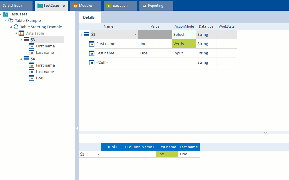 Er ist eine benutzerfreundliche Möglichkeit, durch Tabellen zu navigieren und diese zu bearbeiten, insbesondere wenn es um mehrere Zeilen, Spalten und Testschrittwerte geht. Verwenden Sie ihn, um einfach alle Testschrittwerte und die entsprechenden Aktionen in einem speziellen Reiter zu sehen, wodurch es einfacher wird, Ihre Daten auf einen Blick zu verstehen und anzupassen.