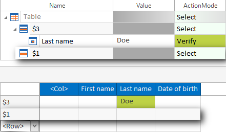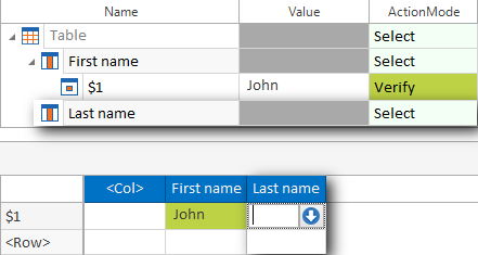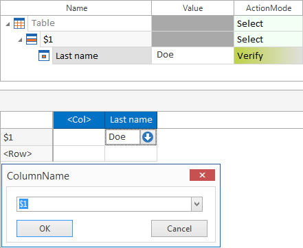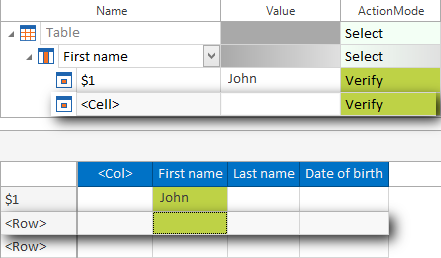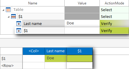 Die gewählte Spalte wird im Tabellensteuerungs-Editor angelegt. In den Details wird für die gewählte Zeile eine Zelle mit der Aktion Verify angelegt.