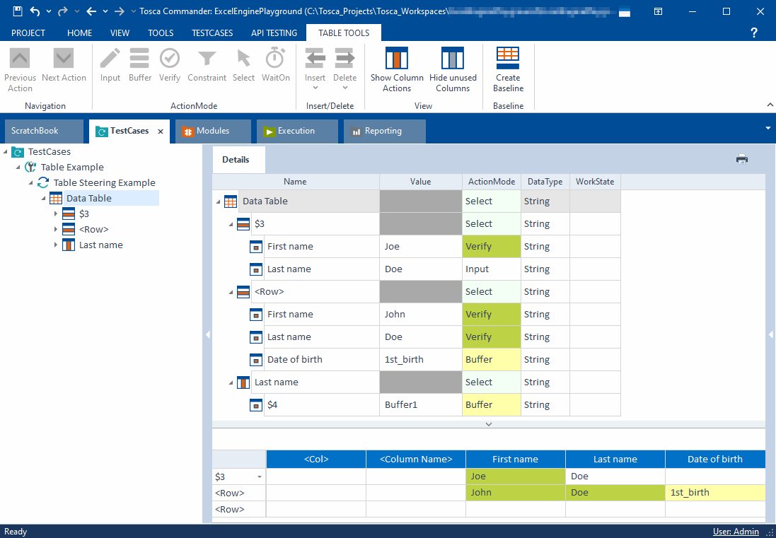 Auf dem Reiter TestCases steht Ihnen sowohl diese Ansicht als auch das Menü Table tools zur Verfügung, wenn Sie eine Tabelle, Zeile oder Spalte in der Baumansicht auswählen. Um eine Tabelle in der Baumansicht anzuzeigen, wählen Sie die Aktion Select für die Tabelle aus.