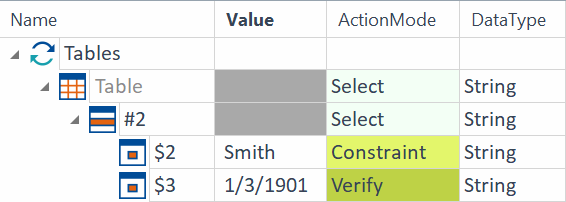 In der Tabelle soll die zweite Zeile gesucht werden, in der die Attribute First name den Wert Peter und Last name den Wert Smith besitzen. Daher wird für die Auswahl der Zeile der Wert #2 eingetragen. In dieser Zeile soll die Engine überprüfen, ob das Attribut Date of birth in dieser Zeile dem Wert 1/3/1901 entspricht.