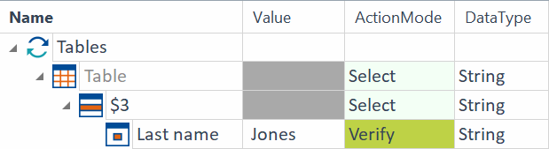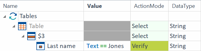 In einer Tabelle wird die Zeile 3 ausgewählt. In dieser Zeile wird überprüft, ob in der Spalte Last name der Wert Jones vorkommt.