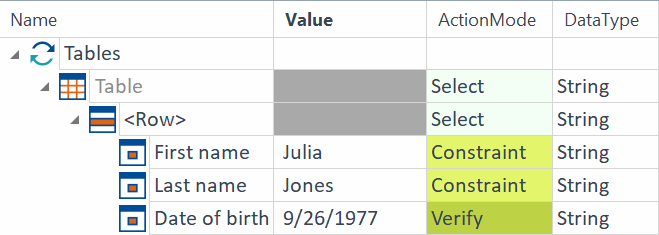In einer Tabelle wird eine Zeile gesucht, die das Attribut First name mit dem Wert Julia und das Attribut Last name mit dem Wert Jones besitzt. In der Zeile, die diese Werte enthält, soll verifiziert werden, ob das Attribut Date of birth mit dem Wert 9/26/1977 vorkommt.