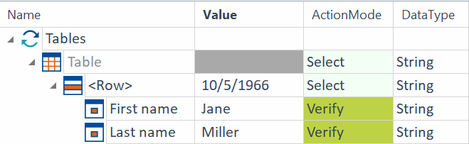 In einer Tabelle wird eine Zelle gesucht, die den Wert 10/5/1966 besitzt. In der Zeile, die diesen Wert enthält, überprüft die Engine, ob das Attribut First name den Wert Jane und das Attribut Last name den Wert Miller enthält.
