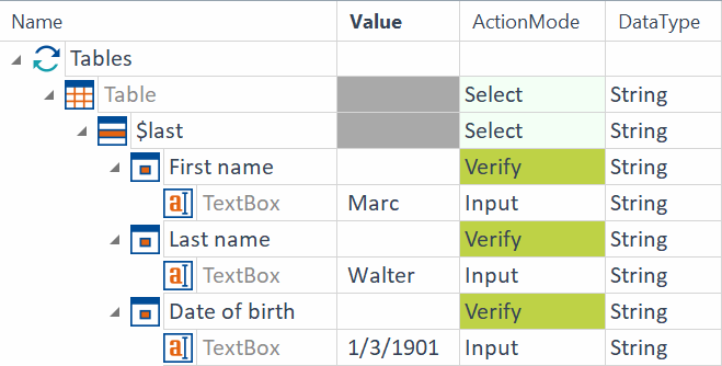 Mit der Syntax $last sucht die Engine nach der letzten Zeile der Tabelle. In dieser Zeile sollen für das Attribut First name der Wert Marc, für das Attribut Last name der Wert Walker und für das Attribut Date of birth der Wert 12/24/1980 eingegeben werden. In jeder dieser Zellen ist eine Textbox eingebettet.
