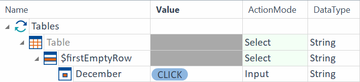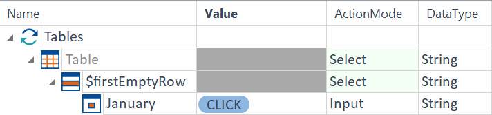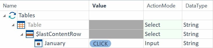 FirstEmptyRow LastContentRow Die Spalte February ist als entscheidend für die Steuerung definiert (decisive column). Dadurch wird in der Spalte February nach der letzten Zelle mit Inhalt gesucht und in derselben Zeile in der Spalte January in die Zelle mit dem Wert $30.00 geklickt.