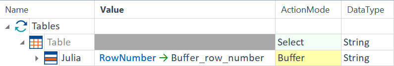 Mit der Eigenschaft RowNumber können Sie die Zeilennummer der Tabelle ermitteln, in der sich ein definierter Wert befindet. Definieren Sie einen Wert aus der ersten Spalte Ihrer Tabelle. In diesem Beispiel schreibt die Engine die Zeilennummer des Wertes Julia in die Buffer_row_number. Das Ergebnis ist 3.