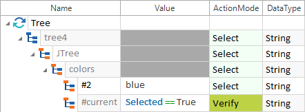 TreeView Struktur Im Testfall verwenden Sie die Aktion Select für die TreeView tree1. Die TreeView tree4 und die Einträge JTree und colors erhalten die Aktion Select. Unterhalb vom Eintrag colors erhält der Testschrittwert den Namen #2 und den Wert blue um den zweiten Eintrag mit dem Wert blue zu suchen. Mit der Aktion Verify auf die Eigenschaft Selected wird geprüft, ob der aktuell gefundene Eintrag selektiert ist.