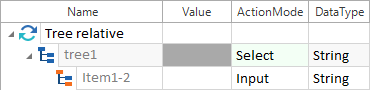 TreeView Struktur Das ModulAttribut Item1-2 besitzt den Konfigurationsparameter BusinessAssociation mit dem Wert Descendants. Im Testfall verwenden Sie die Aktion Select für die TreeView tree1. Mit der Aktion Input wird der Eintrag Item1-2 in der TreeView ausgewählt.