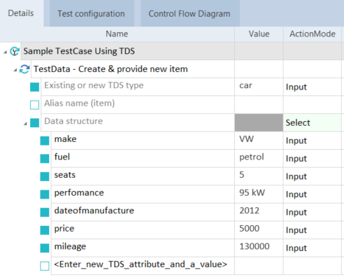 Definieren Sie die Elementdaten unter dem XTestschrittwert Data Structure. Fügen Sie nur die Daten hinzu, die Sie auch tatsächlich für die spätere Suche nach dem Element benötigen. Wenn Sie den Testfall ausführen, erstellt Tricentis Tosca ein Element des Typs car und den definierten XTestschrittwerten make, fuel, seats, performance, dateofmanufacture, price and mileage.