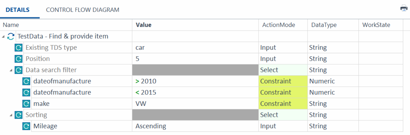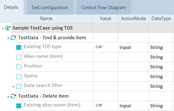 Geben Sie im Testschritt TestData - Find & provide item car als Existing TDS type ein. Wenn Sie den XTestschrittwert Alias name (item) leer lassen, verwendet Tricentis Tosca den Eintrag unter Value des Existing TDS type.