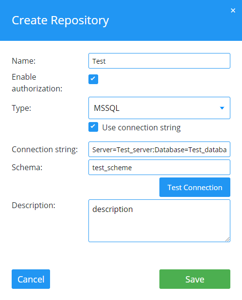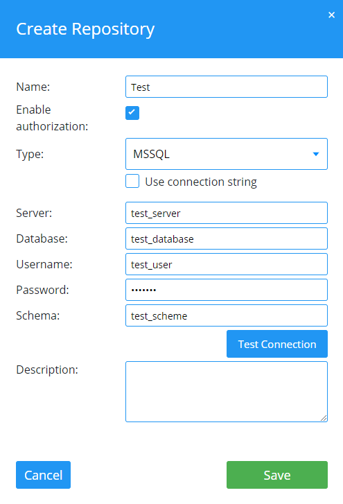 Optional können Sie eine Verbindungszeichenfolge verwenden, um Zugriffsinformationen für MSSQL- und Oracle-Repositorys bereitzustellen. Aktivieren Sie das Kontrollkästchen Use connection string und füllen Sie das Feld Connection string aus.