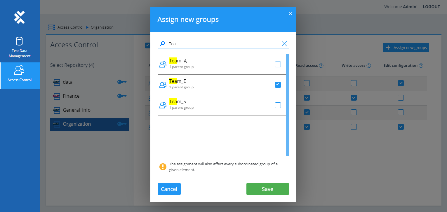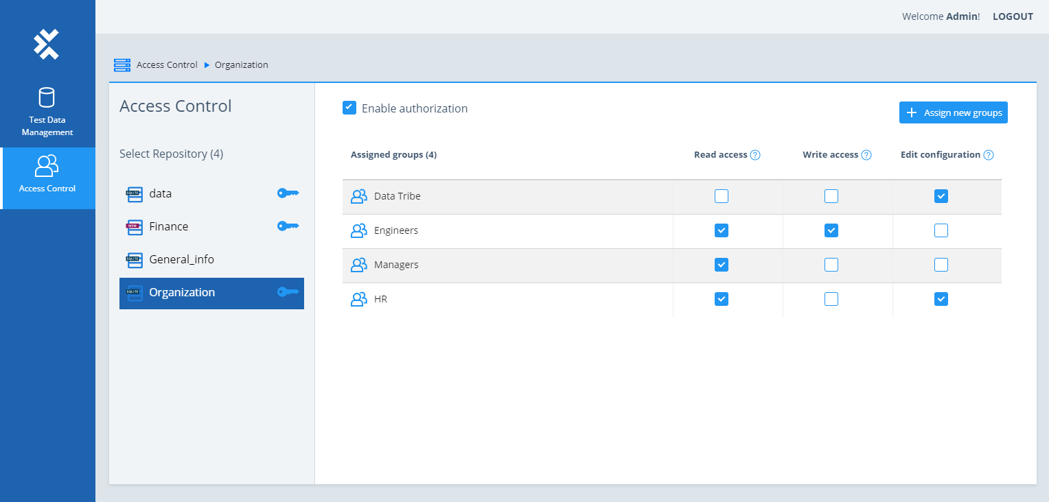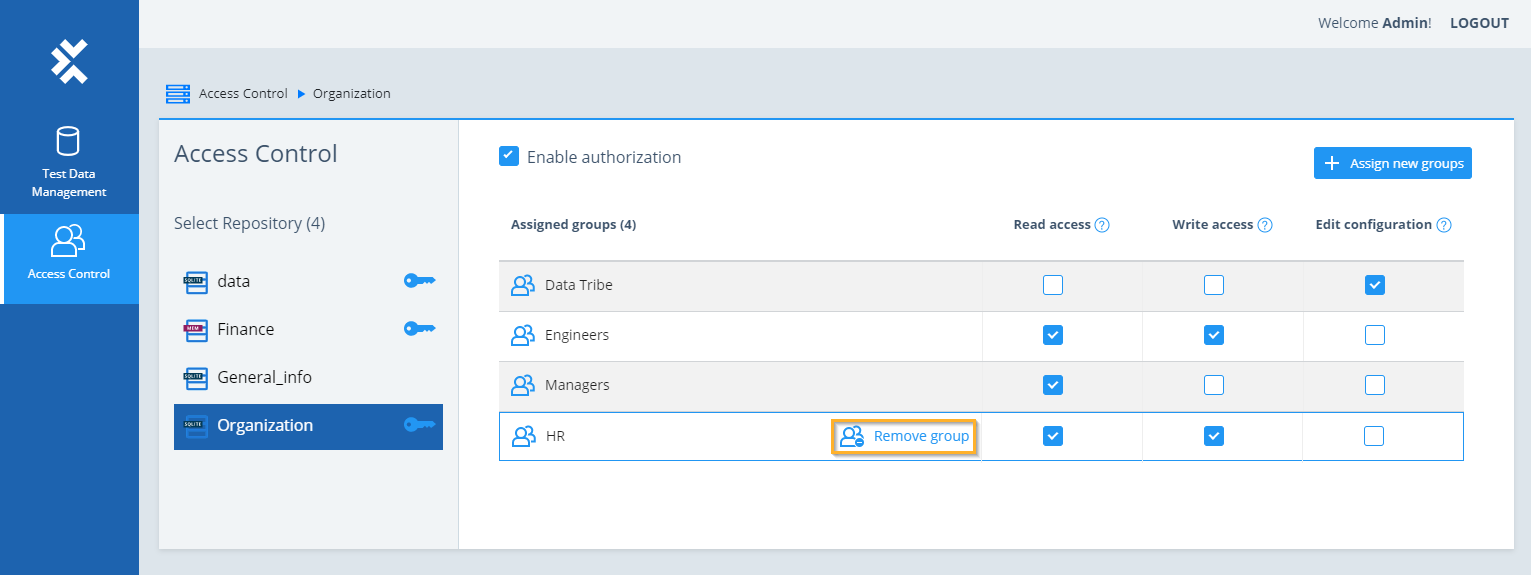Die Webapplikation Test Data Management ermöglicht es Ihnen als Test Data Service-Administrator, Zugriffsrechte für Gruppen festzulegen. Öffnen Sie das Test Data Management und gehen Sie zu Access Control. Hier können Sie Folgendes tun: